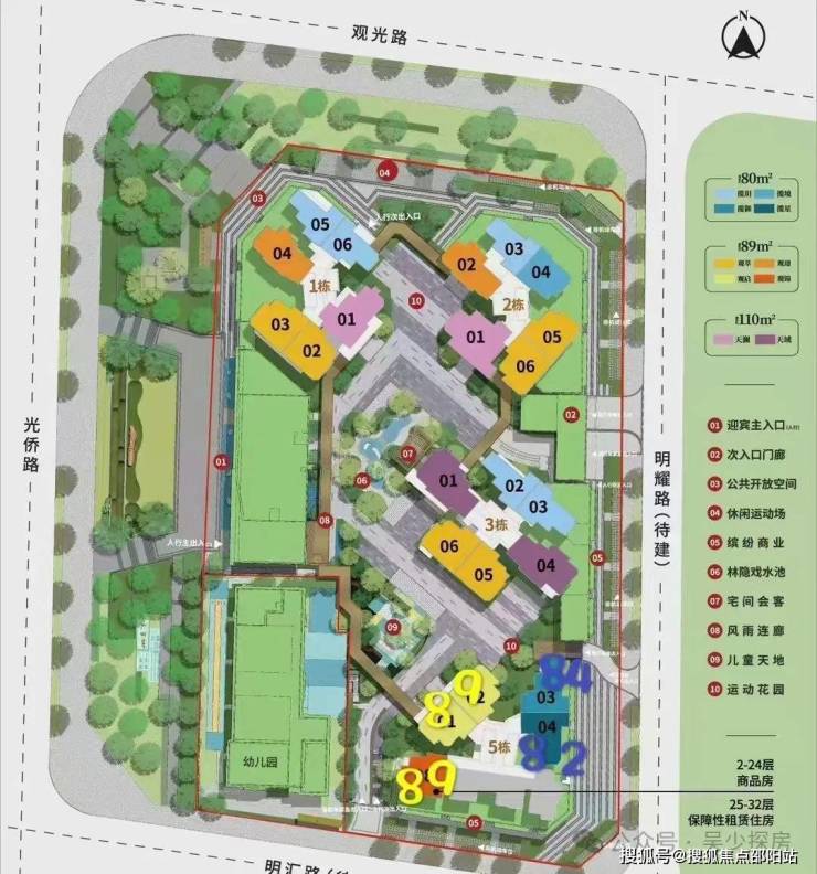 总占地面积约1.43万㎡,总建筑面积约11.49万㎡,计容建筑面积约7.91万㎡,容积率5.4,绿化率35.1%,共由4栋总高32-33F住宅组成,其中1/2/3栋商品房33F,5栋商品房+保障房32F,4栋是1所6班制幼儿园。