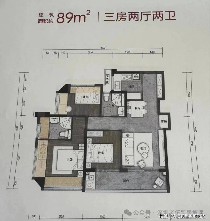 89㎡的3房2厅2卫,设计的是竖厅格局,客厅3.4米开间,LDKB一体化,S墙设计预留冰箱卡槽位,3个卧室分别做到了3.9米/2.9米/2.6米的宽度,客厅连接次卧出6.3米长的大阳台,L型厨房,卫生间干湿分离,有西北、西南或东南朝向。