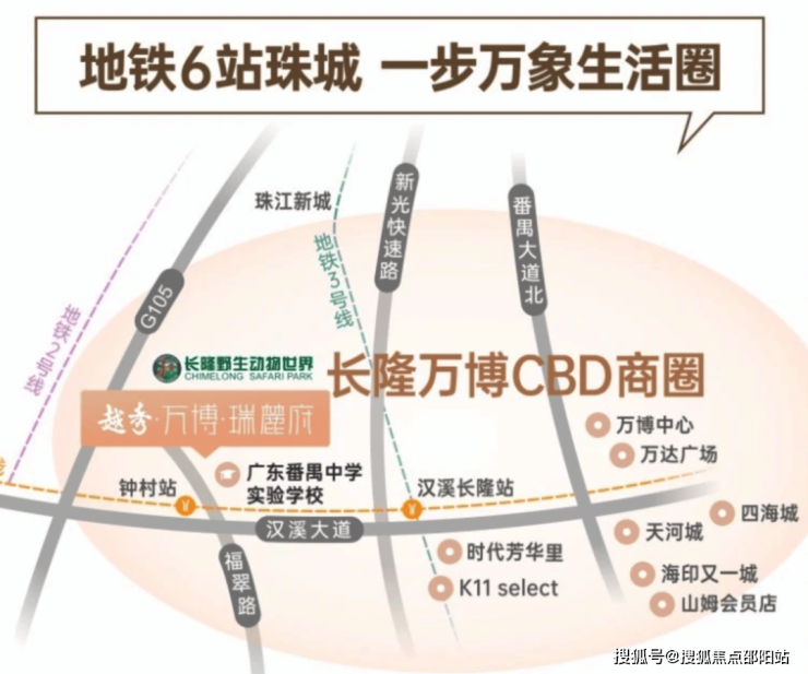 驾车约 10 分钟就能到达长隆万博 CBD,约 30 分钟可到珠江新城,前往琶洲、大学城等地的时间也能控制在 40 分钟以内。整体来看,项目交通除了地铁距离稍远,自驾出行还是比较方便的,若能解决地铁接驳问题,通勤将更为便捷。