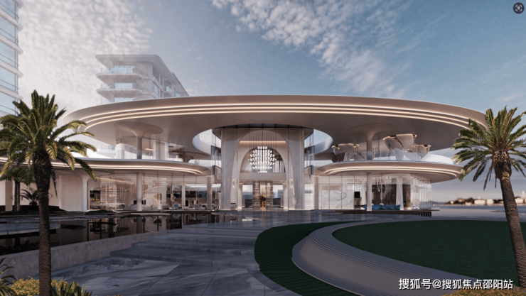 邱德光设计岛心多维共享空间,如社区“灯塔”,以蔚蓝泳池为视觉心脏,用拱廊构建地中海式或南洋风情社交氛围,涵盖恒温泳池、宴会厅、雪茄室、瑜伽室、咖啡厅、茶室等塔尖社交场域。