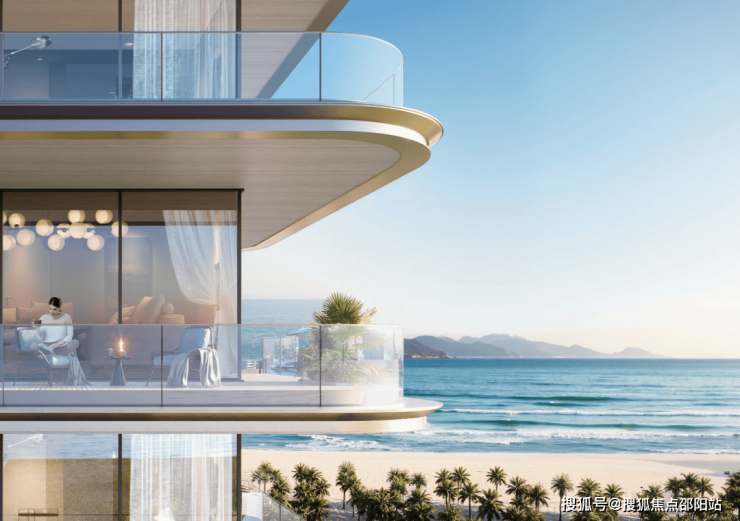 建筑以“超流体立面”呼应海浪肌理,通过悬挑阳台、底层架空消解建筑与水岸的边界,搭配 270° 观景阳台、云端泳池、环形瞰海露台等设计,让河景、海景与生活空间深度交融,成就“外揽海之豪迈,内藏河之幽静”的谧境岛居。