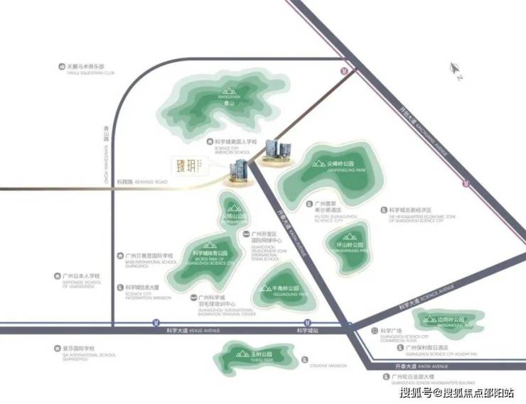三山五园六连廊环绕香山、尖峰岭、尖塔山三座自然山体科学城体育公园·玉树公园·环山岭公园·牛角岭公园·边岗岭公园五大公园;拥揽映日桥、揽月桥等六座空中连廊,串联约13.12公里的科学城云端绿道,畅享国际森活方式