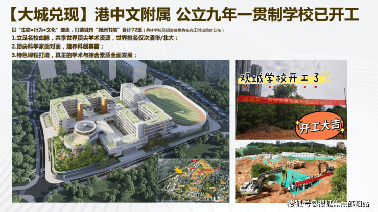 <教育>:项目规划5所幼儿园及3所九年一贯制学校(含72班、54班规模),72班制的学校是港中大附属学校,目前已经开工。明年竣工,最具有国际化的一所学校;