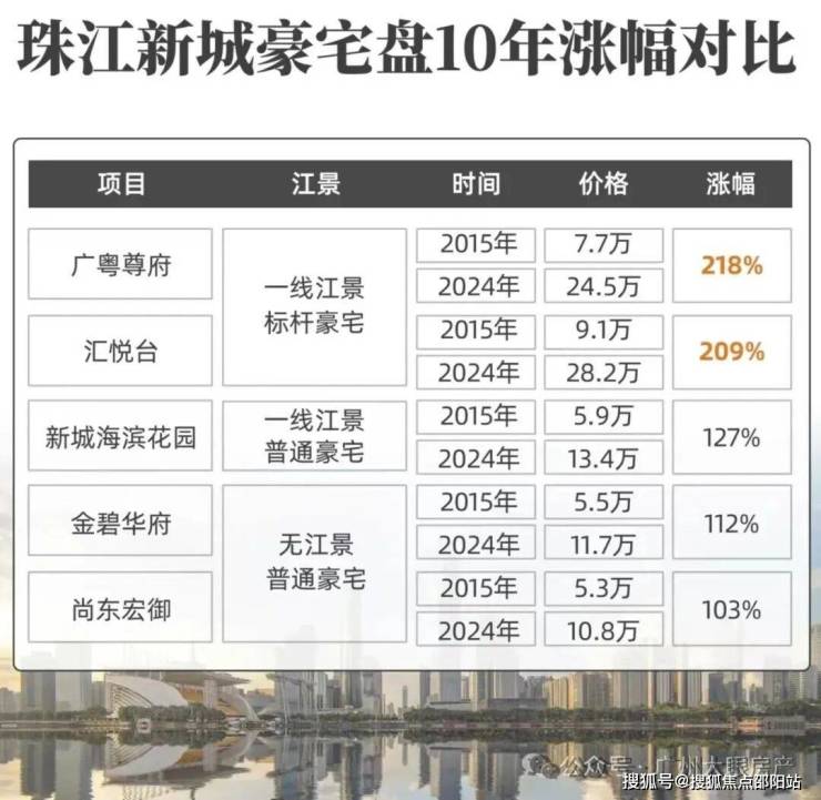 像同在珠江新城东区,占据一线江景的标杆顶豪盘,不仅总价更高,涨幅也远远甩开其它没有江景或者品质一般的豪宅盘。