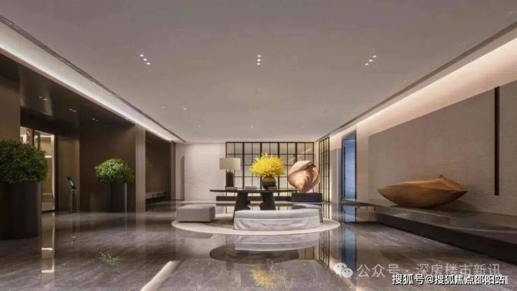 顶奢酒店式入户大堂,石材铺装,打造尊崇的三重归家礼序,开敞阔绰奢豪,点缀多元艺术美陈。
