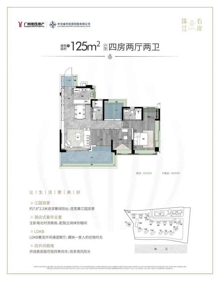 建面约126平四房两卫有横厅和竖厅可选,各具特色。126平横厅户型,同样采用LDKB一体化、南向四开间设计,南北通透。约8.3*2.2米的的超长景观阳台,让园景一览眼底,也进一步提升了整体的空间尺度感。
