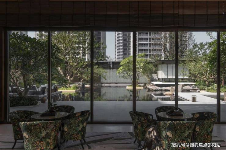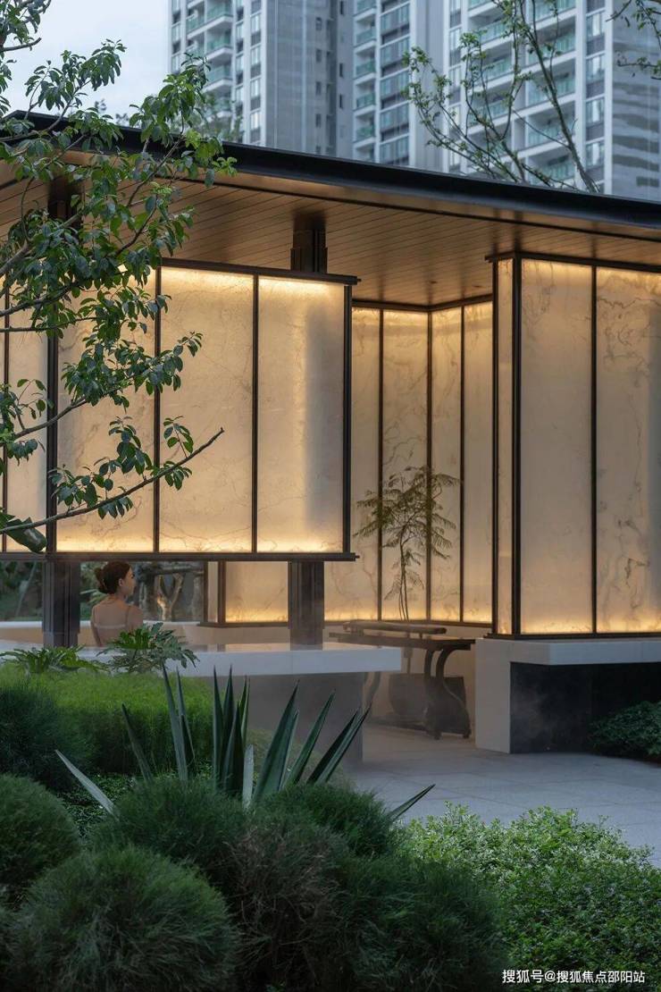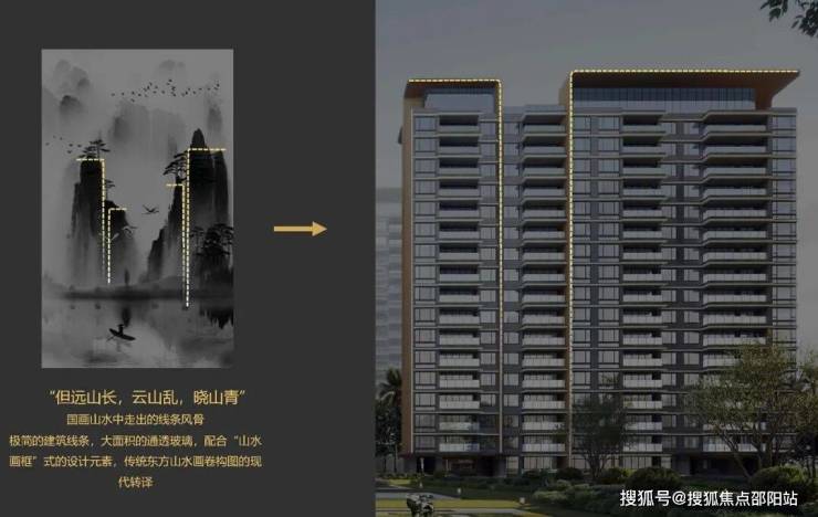 “但远山长,云山乱,晓山青” 国画山水中走出的线条风骨,极简的建筑线条,大面积的通透玻璃,配合“山水画框”式的设计元素,传统东方山水画卷构图的现代转译