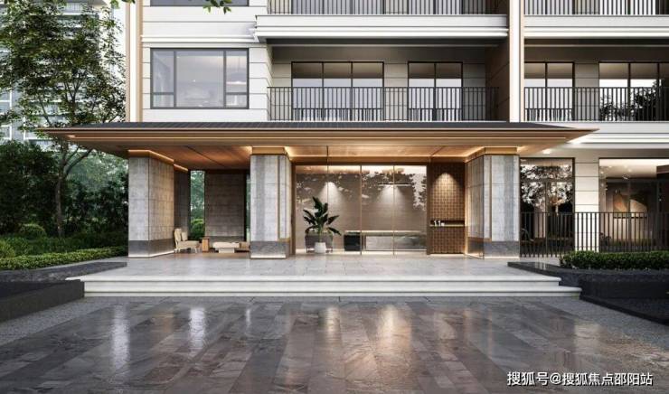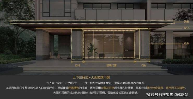 入户单元门头整体和小区入口大堂呼应,顶部强调轻薄精致的挑檐,两侧采用大象灰石材哑光面和拉槽面,搭配定制蟒水纹金属网,尊贵而不失精致,大面积采用的浅灰色材料跟出挑舒展的雨棚,营造出轻松写意的度假感。