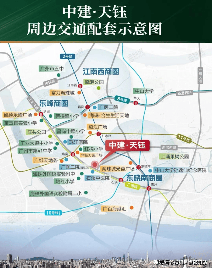 中建天钰位于海珠区核心地段,周边轨道交通资源丰富。项目位于广佛线燕岗站与石溪站之间,步行至燕岗站约750米,至石溪站约900米。燕岗站是广佛线与大环线11号线的换乘站,可快速通达琶洲、天河、越秀等核心区域。石溪站未来将成为广佛线和10号线的换乘站,可直达珠江新城,实现东西南北方向的通达。