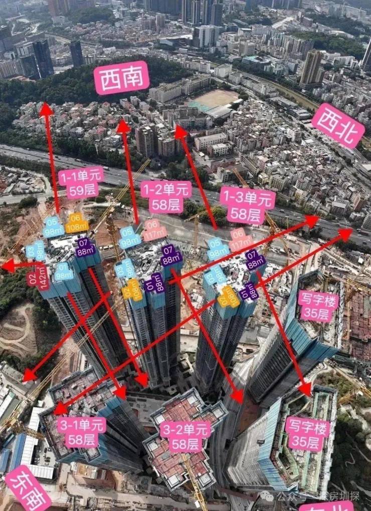本次首推的08地块,备案名:未来平方云山府,由鸿荣源集团打造,共分3期建设,总占地面积约2.73万㎡,总建筑面积约37.41万㎡,计容建筑面积约27.51万㎡,容积率9.23,绿化率32.01%,共由5栋58-59层高住宅组成,其中1栋1单元住宅59F,1栋2/3单元住宅58F,3栋1单元/2单元住宅58F,4栋1/2单元写字楼35F,2栋是1所18班幼儿园,配建有公交首末站。
