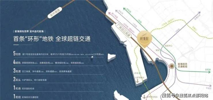 5地铁:直线距离约800米11号线宝安站,邻近地铁1/5/11号线/28号线(规划)/15号线首条“环形”地铁(建设中)4城轨:深港西部快线 (规划) 、深惠城际线(在建)、穗深城际线(在建)、深珠城际线(已规划)3高速:沿江高速、深中通道(在建)、深珠通道(规划)、妈湾跨海通道2码头:大铲湾码头、妈湾客运码头1机场:宝安国际机场1枢纽:前海综合交通枢纽