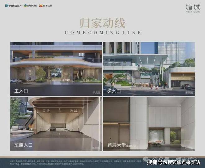 酒店化主入口、次入口、车库入口、首层大堂,酒店化迎宾与归家动线,以无风雨通廊为核,赋予归家更多体验感,带来高效、安心的归家出行之旅。