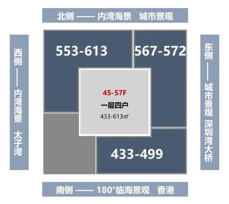 二期推售产品位于17—57F,43F及以下为一层六户产品,45F及以上为一层四户产品——
