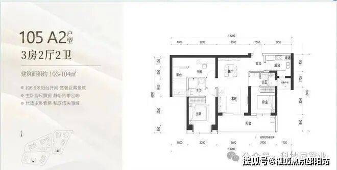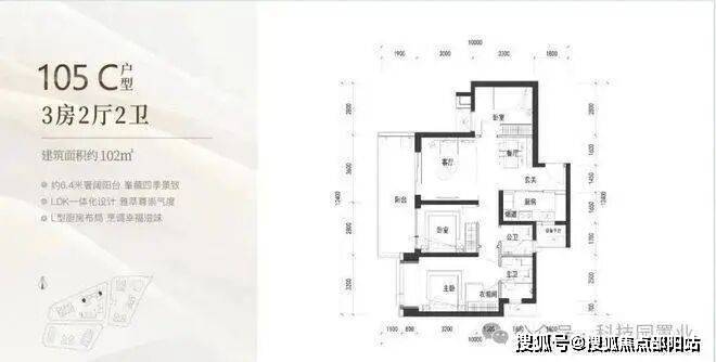 105㎡:竖厅格局,客厅与卧室连通超大阳台,LDK一体化设计,主卧室270度转角飘窗,看城市景观,主要朝向为西南和东南