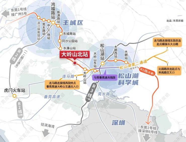 轨道交通:项目位于松湖片区与城区片区交界处,紧邻大岭山北站TOD统筹规划区。该区域是万科在R1线上的第四座TOD项目,具有极高的交通战略价值。项目出小区门口即可步行至R1线大岭山北站(建设中),未来可实现1站东城、3站松湖、5站国贸的便捷出行。此外,松山湖第二通道(规划中)的建成将进一步缩短项目与鸿福路商圈、松山湖万象汇等核心商圈的距离。