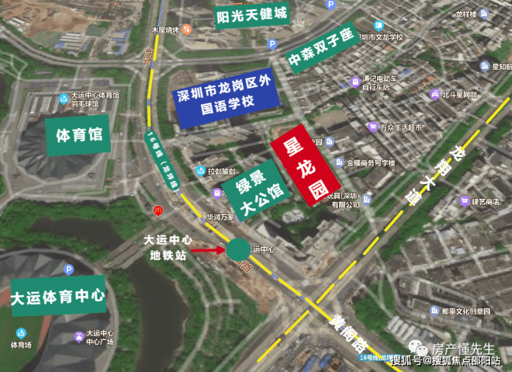 项目位于龙城街道龙翔大道与黄阁路交汇处东北侧。北侧一路之隔是龙岗外国语学校,西侧是绿景大公馆(与大运中心体育场馆、大运中心仅一路之隔),南侧是一些民房和厂房(环境比较一般)。