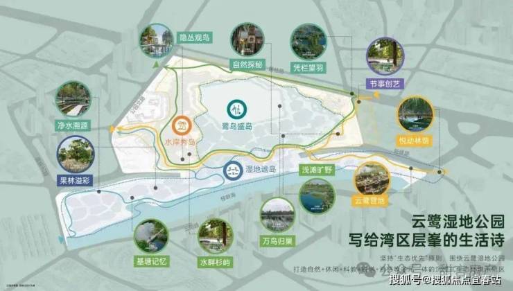 整个公园打造3大主题岛屿、3大游径,串联湿地博物馆、湿地栈道、果基鱼塘、游船码头、云鹭市集、亲子乐园、城市营地等 12 个游玩打卡点,将是家门口集自然+休闲+科教+研学+游憩等多元一体的沉浸式公园体验。