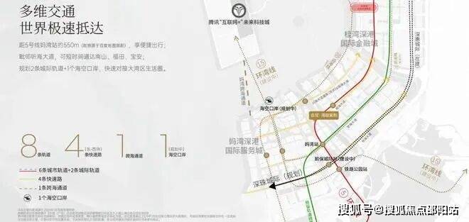 周边共规划6条地铁线、2条城际轨道、1条妈湾跨海隧道及1个海空口岸。 距5号线妈湾站约550m,听海大道贯穿前海,可短时间通达南山、福田、宝安,快速链接大湾区生活圈