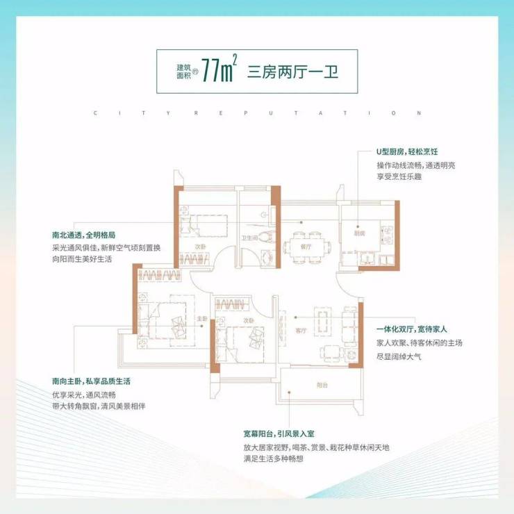 77㎡的3房2厅1卫,1/2栋04户型,设计的是竖厅南北通透格局,客厅3.4米开间,一体化双厅,三开间朝南,主卧270°转角飘窗,U型厨房,卫生间干湿分离,得房率:78.43%(不含赠送),阳台主朝南向。