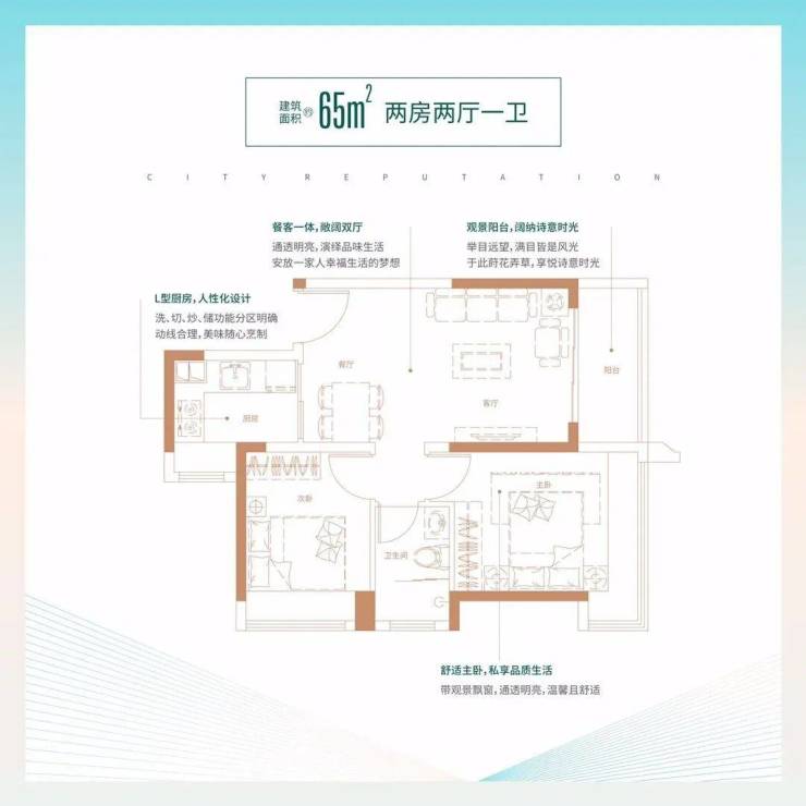65㎡的2房2厅1卫,设计的是竖厅格局,客厅3.3米开间,LDKB一体化,有赠送入户花园(不在户型图内),L型厨房,卫生间干湿分离,得房率:74.71%(不含赠送),全部朝东向看龙凤路。
