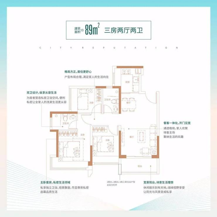 89㎡的3房2厅2卫,5栋01户型,设计的是竖厅南北通透格局,客厅3.6米开间,一体化双厅,三开间朝南,主卧270°转角飘窗,U型厨房,卫生间干湿分离,得房率:74.71%(不含赠送),阳台主朝西南向。
