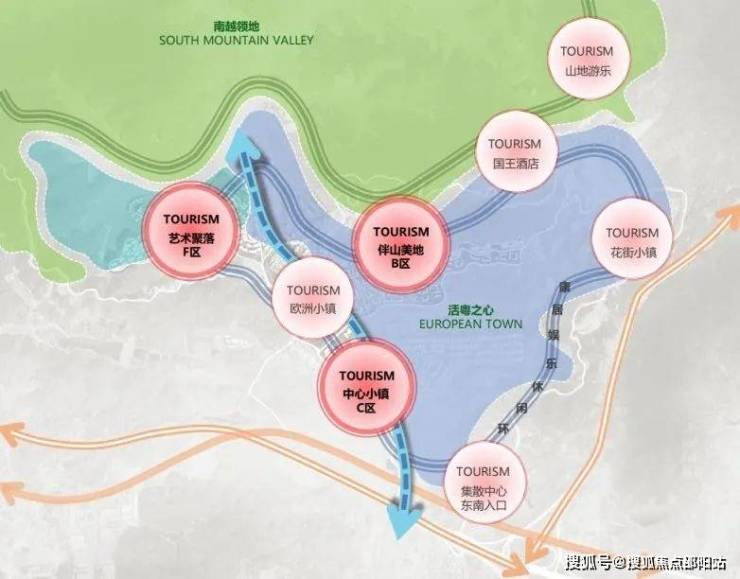 项目重点建设中心小镇C区、艺术聚落F区、伴山美地B区三大园区,并串联现状山地游乐、国王酒店、欧洲小镇与集散中心。