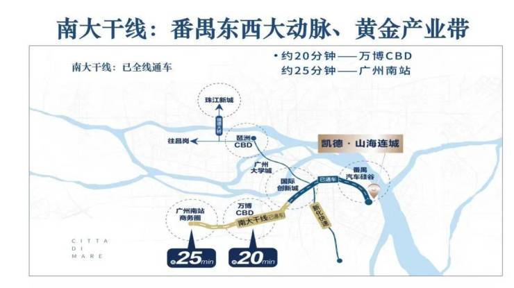 自驾方面,周边有利丰大道、南大干线、广台高速等干线。南大干线全线通车,从项目开车去万博、南站、大学城或琶洲,基本都能在半小时内抵达。