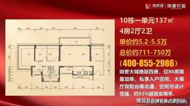 建面约137㎡绝版四房两厅两卫单价:约5.2-5.5万/㎡(备案单价5.19-5.47万/㎡,综合折扣后)总价:约711-750万/套(折后总价710-747万/套)核心优势:唯一在售四房户型,仅86席限量加推,私享入户空间,大横厅设计,南北双阳台通透,实用率高达93%,空间改造性强,4楼王位置,俯瞰2.9万㎡中央园林全景,最大楼间距约161米。