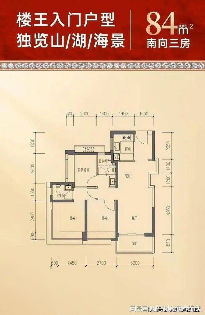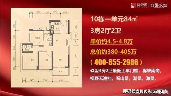 建面约 84㎡全南三房两厅两卫单价:约4.5-4.8万 /㎡(备案单价4.82-5.87万/㎡,综合折扣后)总价:约380-405万/套(折后总价377-404 万/套)核心优势:项目最低上车门槛,稀缺南向户型,视野无遮挡,可眺望山景、湖景、海景,竖厅设计,LDKB 一体化布局,S 墙预留冰箱位,得房率约 77%(不含赠送)卫生间三段式分离,主卧面积约 10.37㎡,次卧均超7.5㎡。