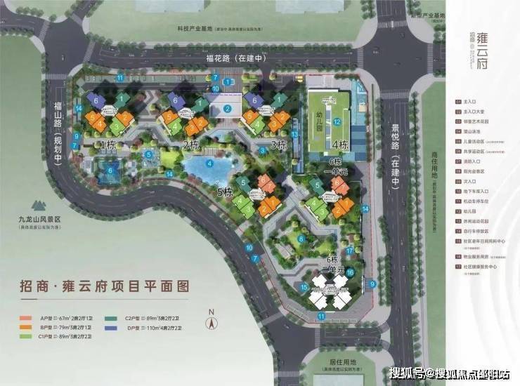 招商雍云府,占地面积约2.7万㎡,建筑面积9.5万㎡,容积率3.59,共由6栋22-31F住宅组成,其中1栋商品房31F,2/3/5栋商品房30F,6栋1单元商品房29F,6栋2单元公共租赁住房22F,4栋是9班幼儿园。总规划1049户(其中商品房927户,公共租赁住房122户),停车位1050个(占比1:1),全部2梯6户设计。