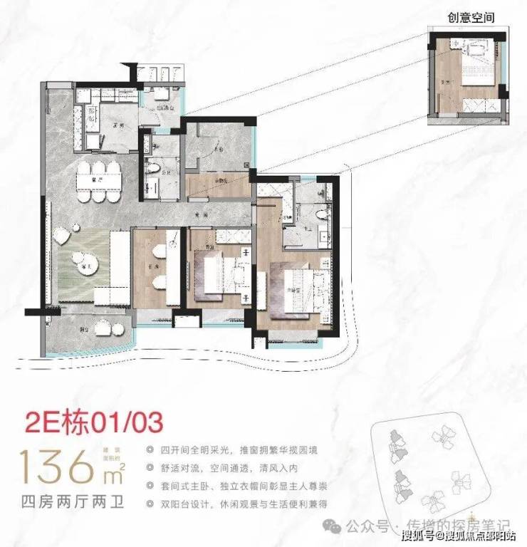 136㎡户型采用南北双阳台,实现最佳通风采光