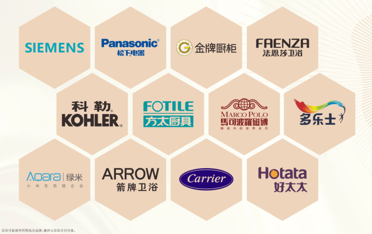 精铸格调,智慧生活 收纳系统:小户型大收纳,全屋定制(建面约33㎡户型),延伸更多生活空间;精粹系统:智能家居系统、中央空调系统、新风系统;品牌家居:方太厨具、科勒卫浴、金牌橱柜、飞利浦灯具、西门子插座、箭牌浴室镜柜& 鞋纳柜等;精工细节:绿米入户门锁、马可波罗防滑地砖、天然大理石等。