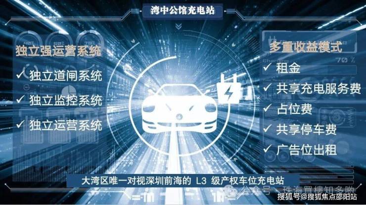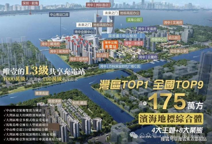 约 175 万㎡集居住、商业、办公、码头、教育、文旅等多样城市功能于一体的国际滨海地标综合体中湾中公馆充电站唯一可对外出售335个车位项目。