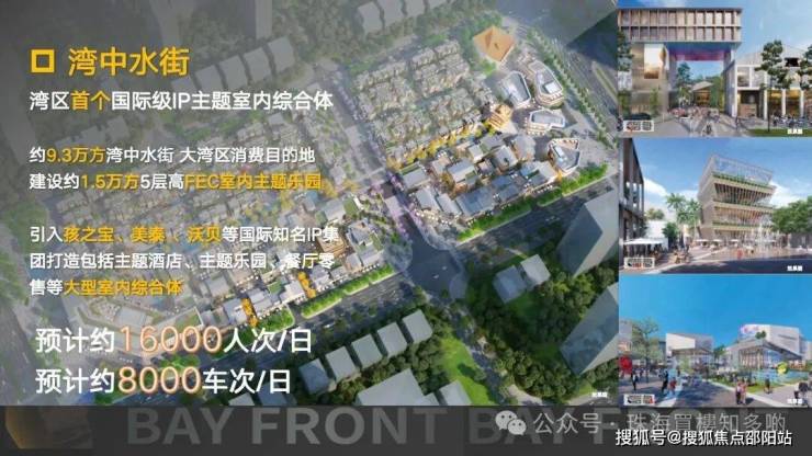 ④特色商业:建面约 9.3 万m湾中水街,以“IP 乐园+商业街区+轻度假”的模式,集亲子游玩、休闲度假、特色餐饮、非遗文创等于一体,计划打造亚洲首个国际 IP 室内主题乐园集群与滨海都市度假目的地,成为中国南部文商旅融合发展新高地。预计日人流量超16000人次,预计车流量超8000车次/日。