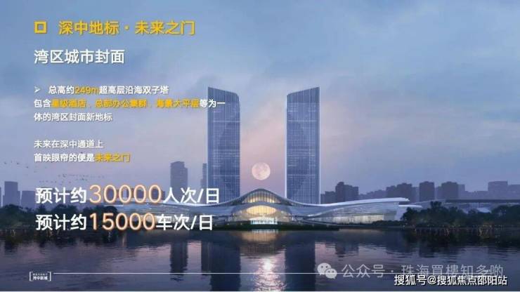 ①地标双塔:沿海双塔超高层总部地标(规划中),约249米高的西岸门户封面,含约4.5万㎡五星级酒店,约25万㎡甲级写字楼,3.5万缤纷商业MALL。未来讲引流大量客流车流到这个区域,停车需求一定是远满足不了的。