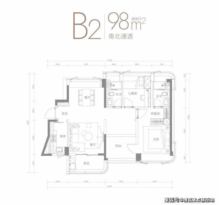 98㎡的3房2厅2卫,设计的横厅南北通透格局,进门入户玄关,客厅3.5米开间,四开间朝南,3个卧室分别是3.2米/3米/2.8米的宽度,L型厨房,阳台主朝西南或东南向。