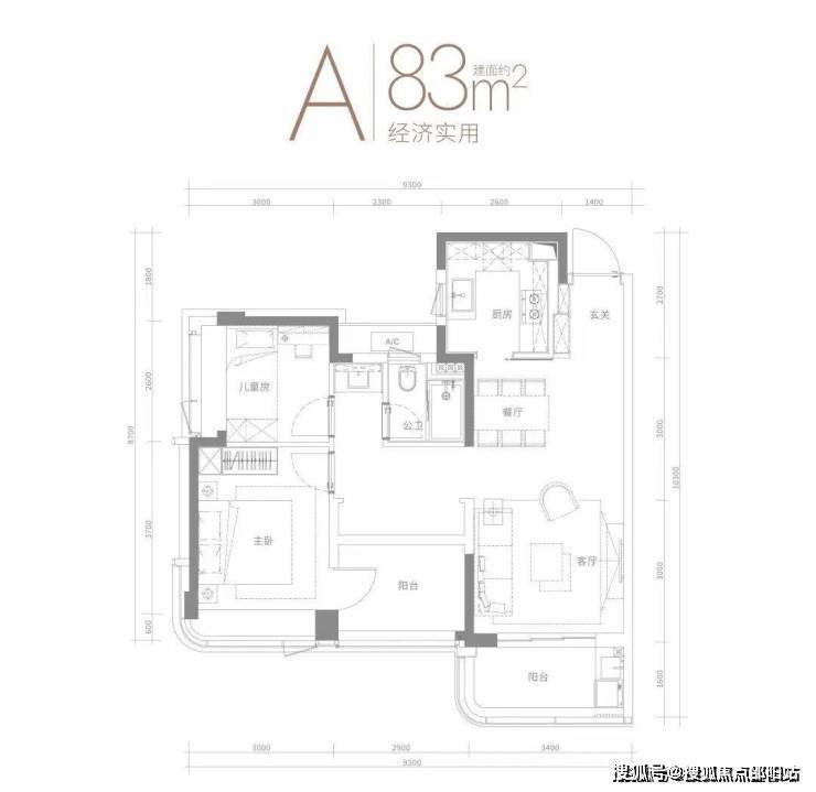 83㎡的3房2厅1卫,设计的是竖厅格局,客厅3.4米开间,客餐厅一体化,三开间朝阳,3个卧室分别是3米/2.9米/2.6米的宽度,U型厨房,卫生间三段式分离设计,有朝南向或东北向。
