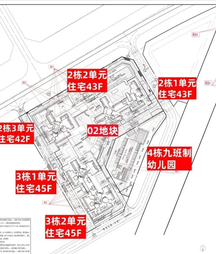 02地块:总占地面积约1.78万㎡,总建筑面积约19.7万㎡,计容建筑面积约13.7万㎡,容积率7.71,绿化率30%,共由5栋42-45层高住宅组成,分别是2栋1/2单元住宅43层,2栋3单元住宅42层,3栋1/2单元住宅45层,4栋配建1所9班幼儿园。