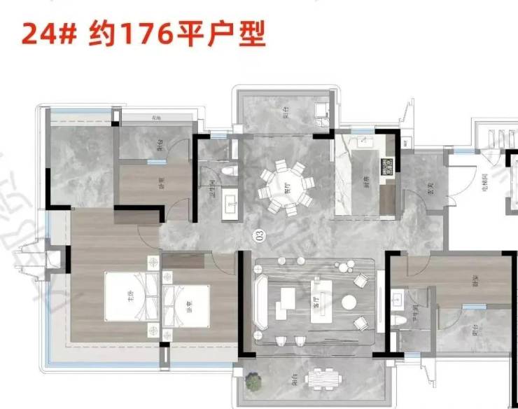 230平户型拥有私家电梯厅、双主套、独立佣人房、南北对流、LDKB大方厅、主卧L型270°飘窗等,大大提升了整体的空间体验。