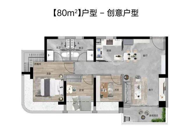 建面约96㎡户型在80㎡户型的基础上新增了一个多功能房,可以布置成书房、休闲房、储藏室,家庭成员多的话用作卧室也完全不成问题,满足多元化的需求。