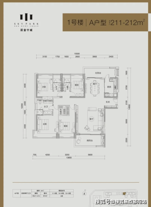 A户型:211-212㎡4房3卫,套内面积167㎡,动静分区,南北通透双阳台,功能性更强。