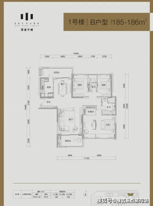B户型:185-186㎡3房2卫,套内面积约146㎡,动静分区,南北通透双阳台,北向可看香蜜公园景观。