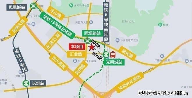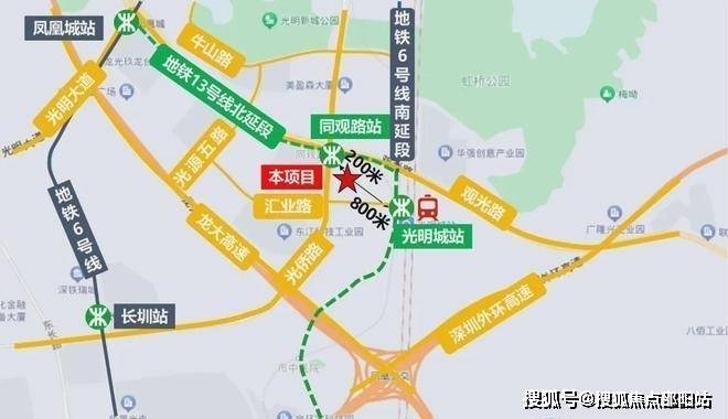 项目位于光侨路与观光路交汇,位于6号线光明城站和13号线德雅路站(原同观路站)中间,到两个地铁站的距离步行时间都在2-8分钟的距离。