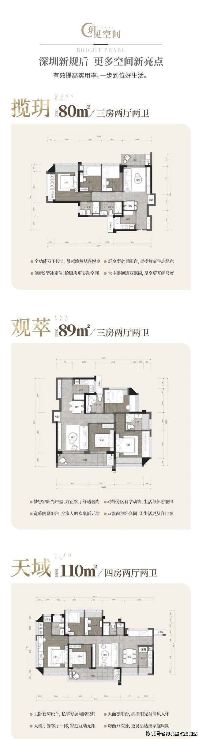 商品房户型为建面约80-110㎡3-4房;其中80㎡是做到了三房两卫(具体以开发商公布为准),目前还在地基中,预计月底左右入市。这看起来得房率也是挺高的,而且还有32-33层高的正常商品房高度必然又是光明商品房市场一条新鲶鱼,目前片区基本是47层左右超高层!如需关注户型图朋友可以添加底部二维码,项目目前已经在巡展宣传资料了,户型图已经出炉,其中80㎡三房两卫,89㎡也是三房两卫但是阳台做到了6.4米的长度在当下同面积户型这阳台确实很给力,且带品质精装交付、配置全屋中央空调。