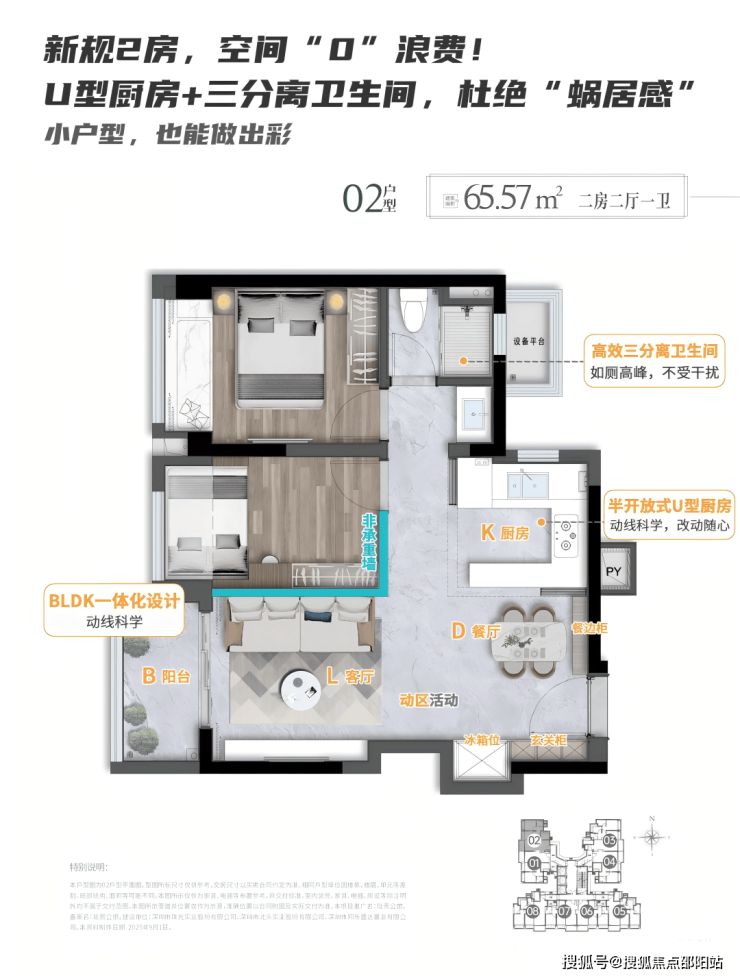 其中,建面约65㎡的两房两厅一卫,共计4款户型,属于南山极度稀缺的产品。