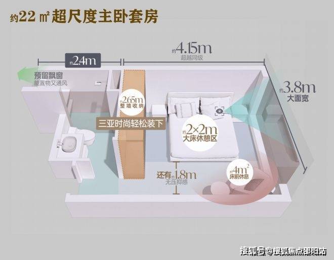 约22㎡主卧大套房,约3.8m南向面宽,全景飘窗,营造出开阔的空间感,晨曦午后,悦心私享天地。