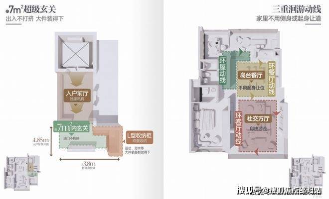 约8.48㎡私享前厅,从出电梯到入户门之间的阔气前室空间就相当于你家的私人领地,鞋柜、收纳柜、步入式玄关随你打造。