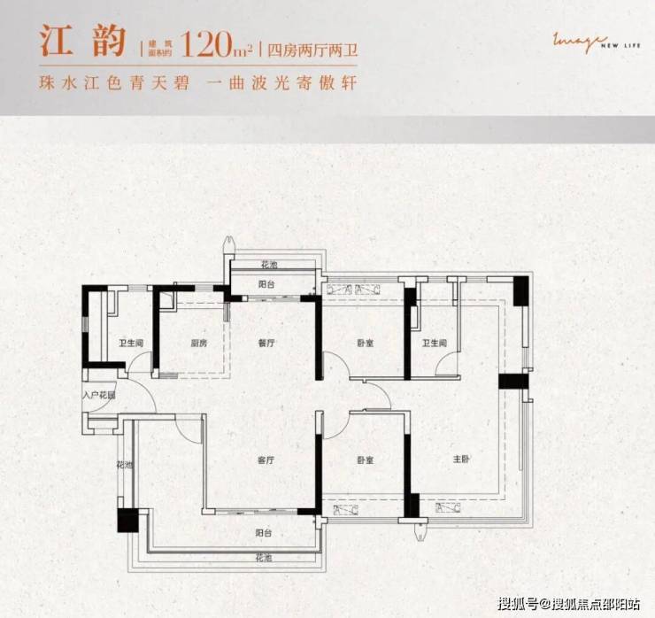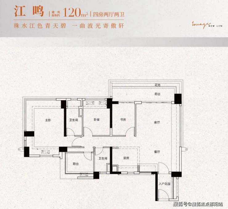 建面约120㎡:四房两厅两卫设计,共有2个户型可选,四开间朝南,居住与生活动静分离,南向大阳台或南北双阳台,主卧带270°飘窗