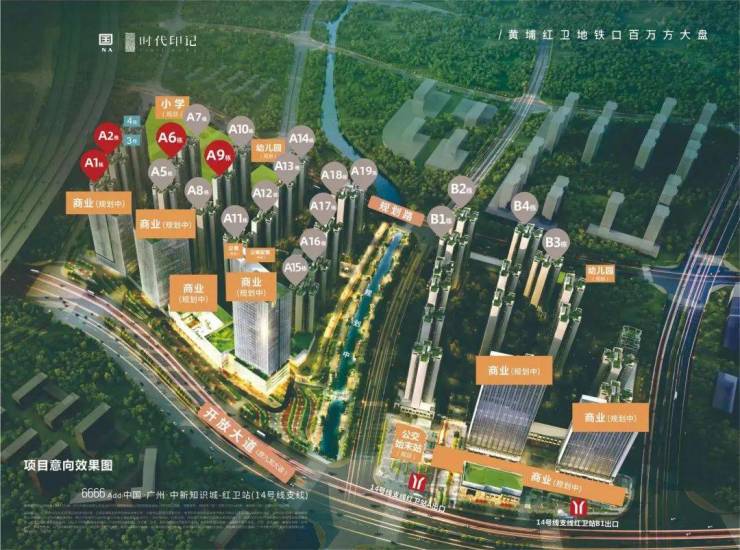 时代印记位于黄埔区14号支线红卫站口,三条地铁线环绕,出门即是红卫地铁站。