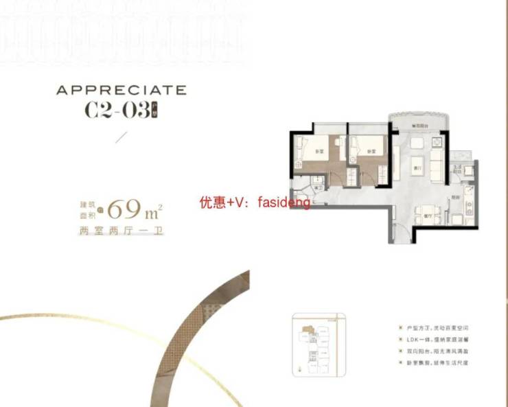 先来看看最小的户型——建面约69㎡两房!这是一个北向单位,面积虽小,却配备了两个阳台和两间卧室,算是老城核心入门级别的单位。不过,通往卧室的走道稍微显得有些浪费。在产品实用率“内卷”的市场,建面69㎡做两房可能也会显得吸引力不太足。